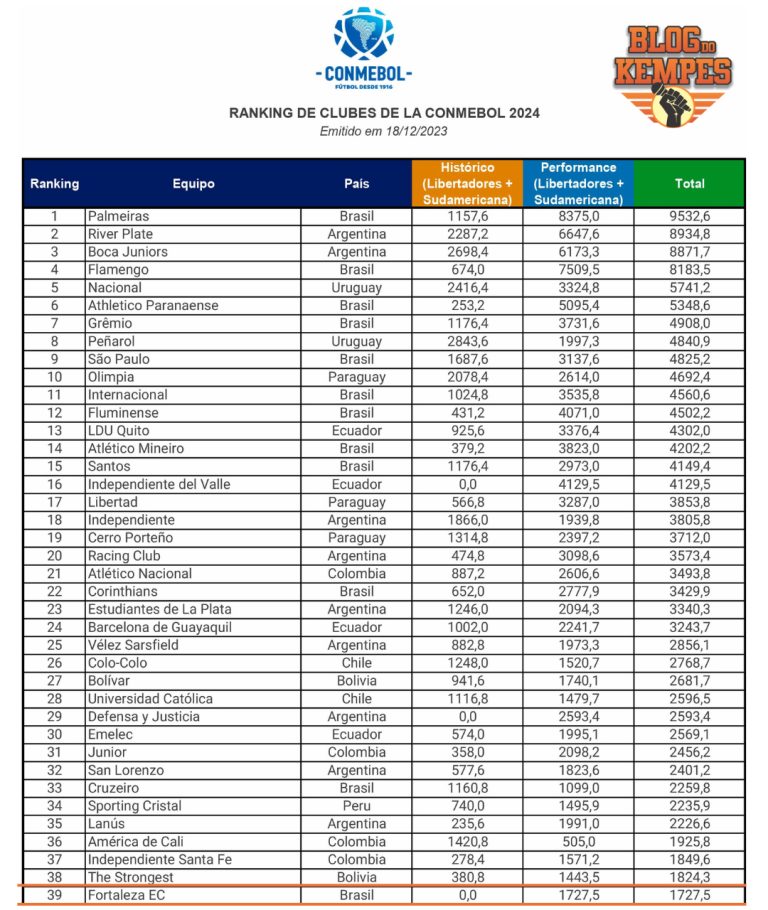 CONFIRA O RANKING OFICIAL DE CLUBES DA CONMEBOL PARA 2024