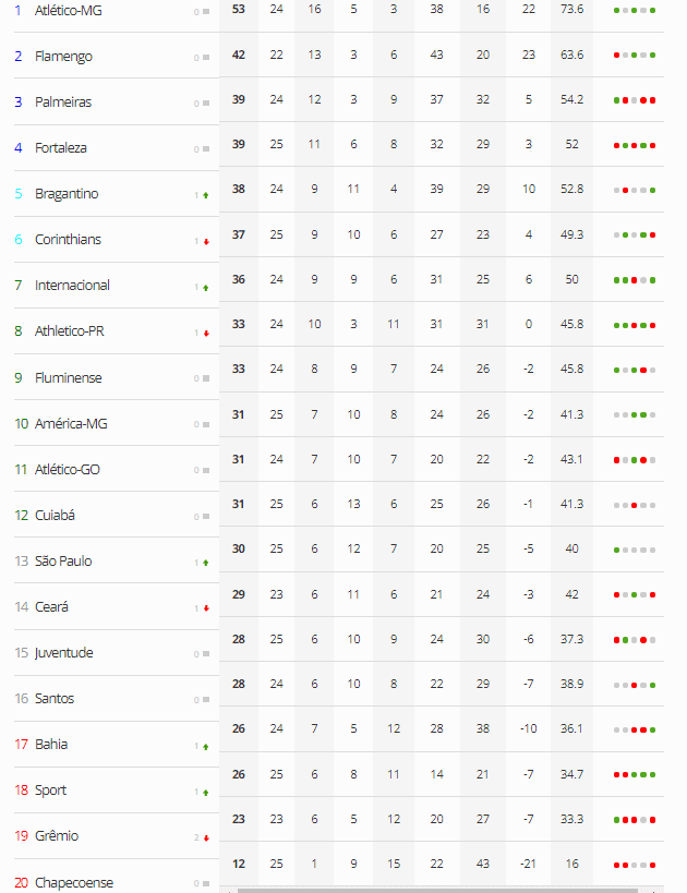 No entanto, a tabela mostra por partes, a primeira delas as equipes que estão na luta pelo título do torneio, por uma vaga na Copa Libertadores e também para se manter no G-6 da competição nacional. Sem contar, as equipes que estão também na busca por posições para a disputa da Copa Sul-Americana.