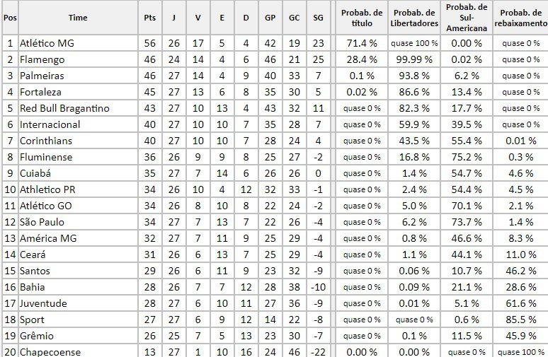 Neste final de semana, a 28ª rodada da o seu ponta inicial na Série A do Campeonato Brasileiro, mas o site do chancedegol atualizou as probabilidades dos times que estão na briga pelo título, uma vaga no G-6 e também para escapar da zona do rebaixamento e ir para a Copa Sul-Americana do ano que vem. No entanto, as chances foram atualizadas.